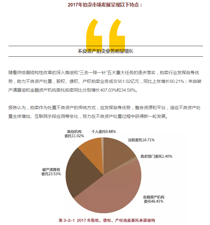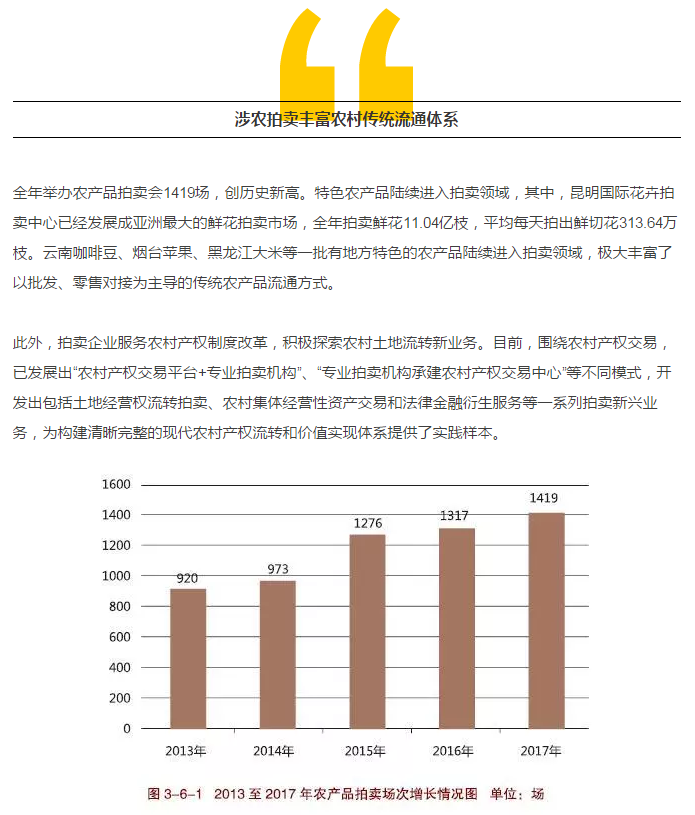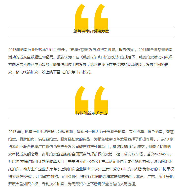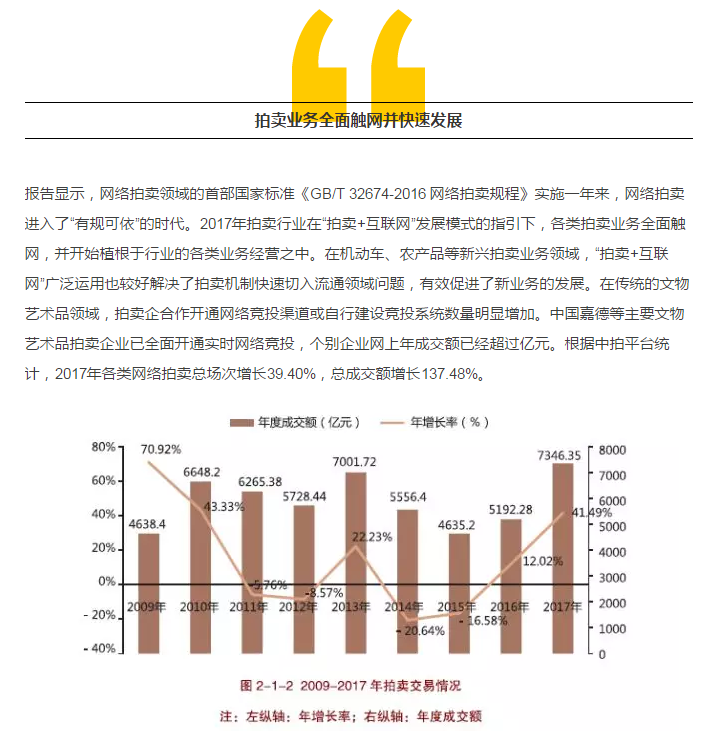 近日,商務(wù)部流通業(yè)發(fā)展司聯(lián)合中國拍賣行業(yè)協(xié)會(huì)在京發(fā)布《中國拍賣行業(yè)發(fā)展報(bào)告(2017)》。報(bào)告顯示,2017年,拍賣行業(yè)規(guī)?;痉€(wěn)定。截至2017 年12 月,全國拍賣企業(yè)共計(jì)7255 家,同比增長4.93%;國家注冊(cè)拍賣師13052 人,同比增長3.1%。全國拍賣成交額累計(jì)7346.35億元,同比2016年增長41.49%,這是自2013 年以來年拍賣交易總額再一次突破7000 億元大關(guān)。